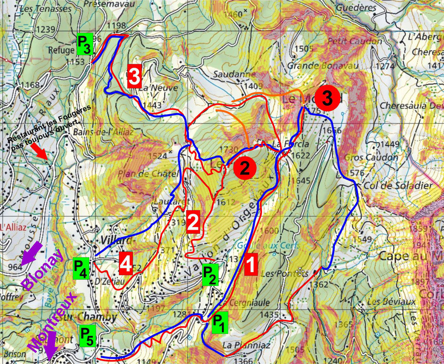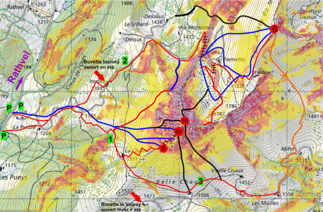 Variante par le tracé orange sur la face Nord. Pentu dans les vernes au départ puis tourner à gauche pour passer le petit col. Ensuite toujours assez raide et une neige pas toujours excellente. Pente herbeuse avec une neige qui glisse facilement dessus. Faire attention parce qu'il y a presque personne qui passe par là ! Ensuite rejoindre la paturage de la Neuve. Si ta voiture est à la Cergniaule, c'est bien de remonter sur la Forcla par une gorge étroite et encaissée avec un possible danger d'avalanche. Très rarement tracé.